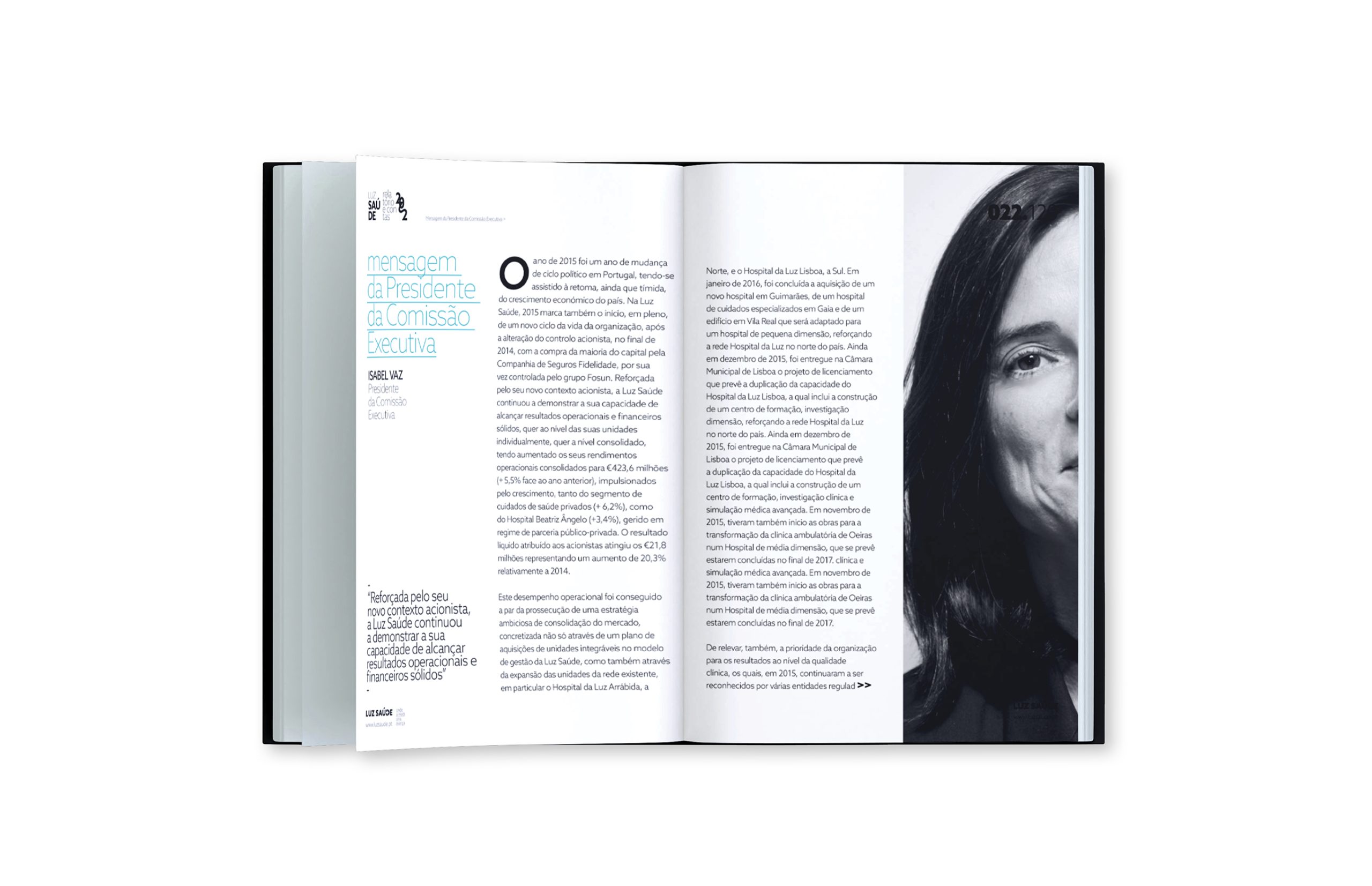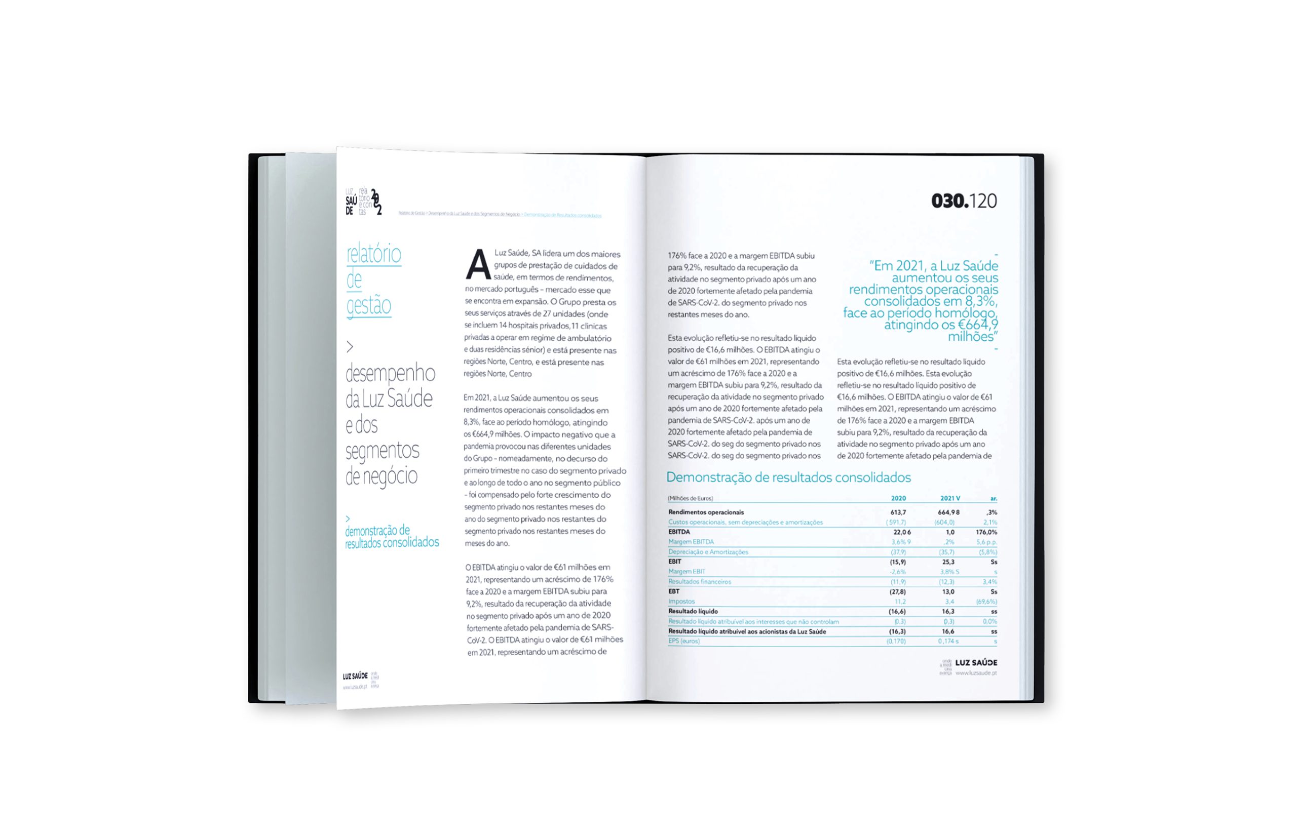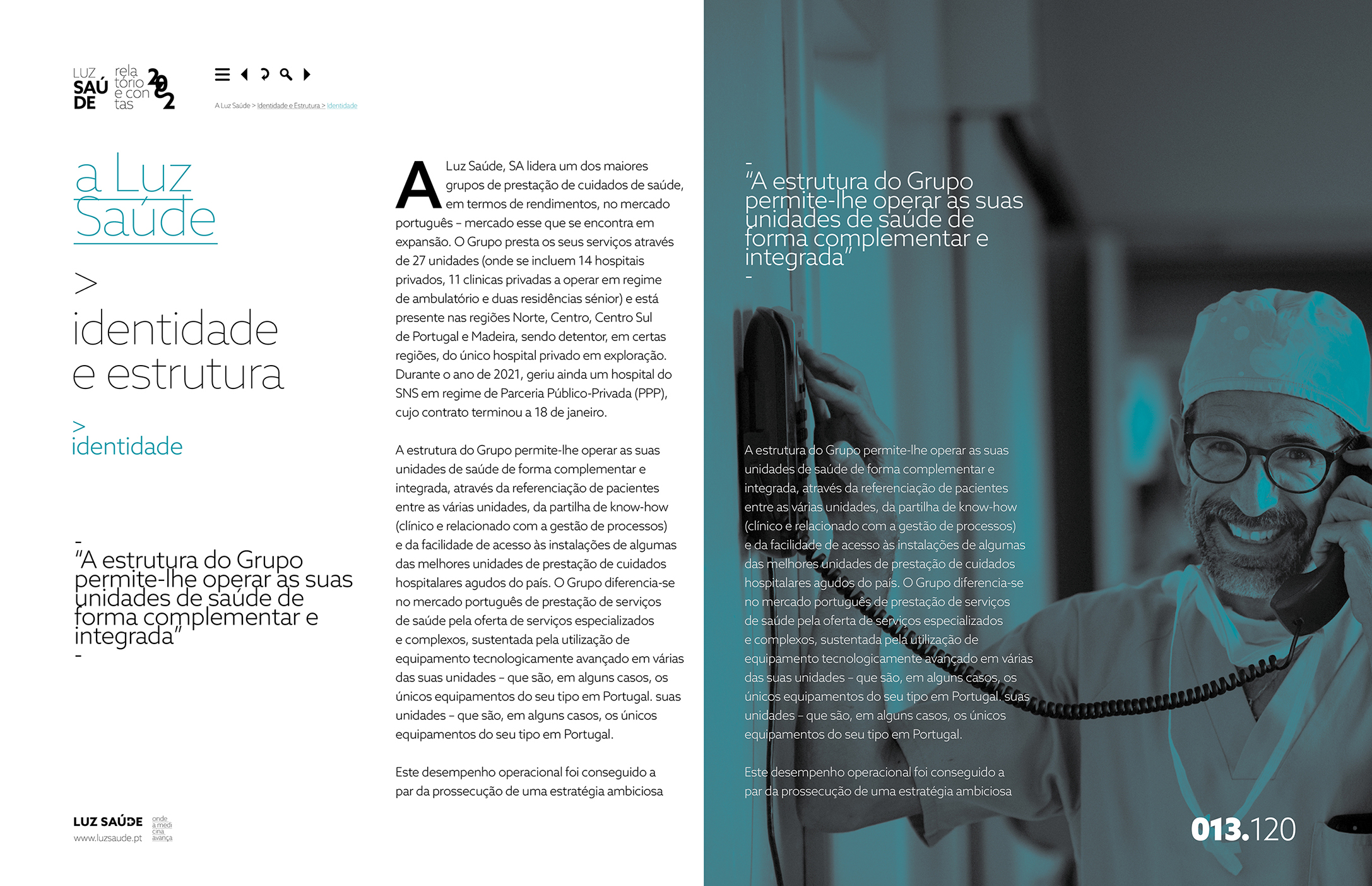 Luz Saúde – Relatório e contas 2022 (em desenvolvimento)Criação de layout, paginação, programação e artes-finais da publicação impressa e online da Luz Sáude – Relatório e contas 2022. (Em desenvolvimento) >BRANDING >COMMUNICATION >EDITORIAL / 2023